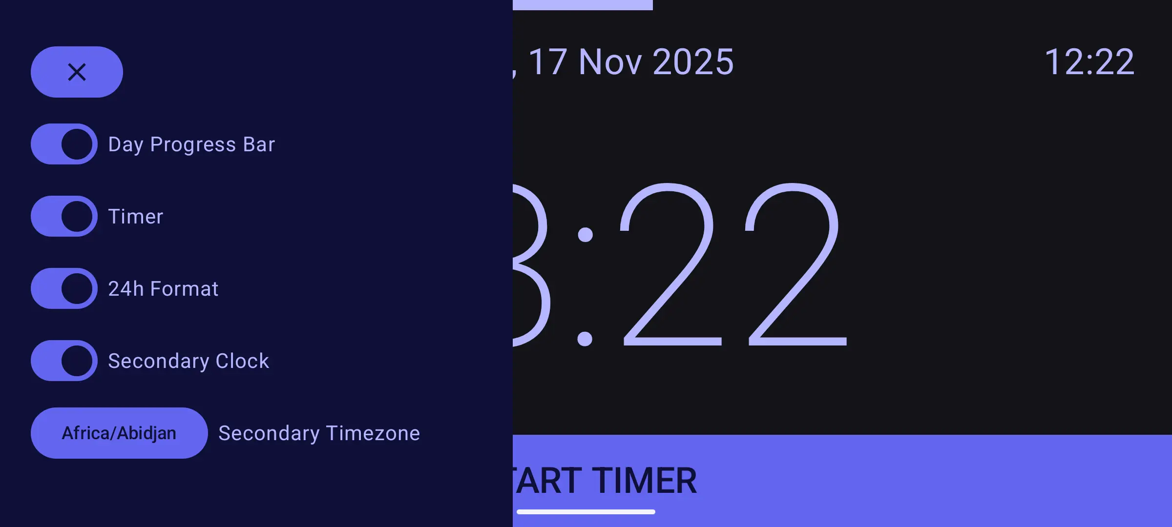 The idea of this app is to give second life to old Android devices by turning them into beautiful desk clocks. The app offers simple customization options for the clock appearance and behavior, allowing users to tailor it to their preferences. Built with Kotlin as a learning experience, the app focuses on clean UI/UX design principles to provide an intuitive and visually appealing user experience. The main features include setting timers, displaying the date and an optional second time zone.